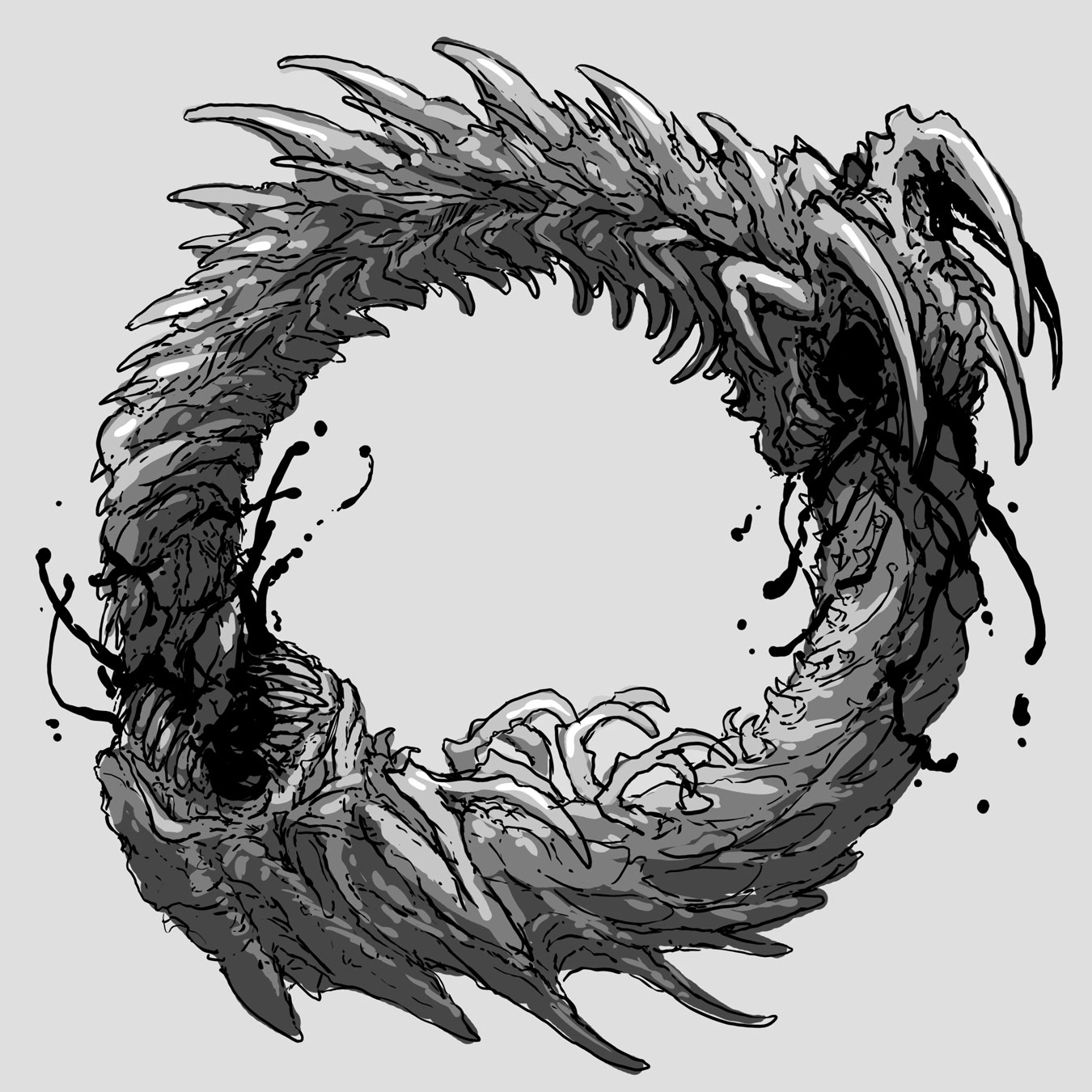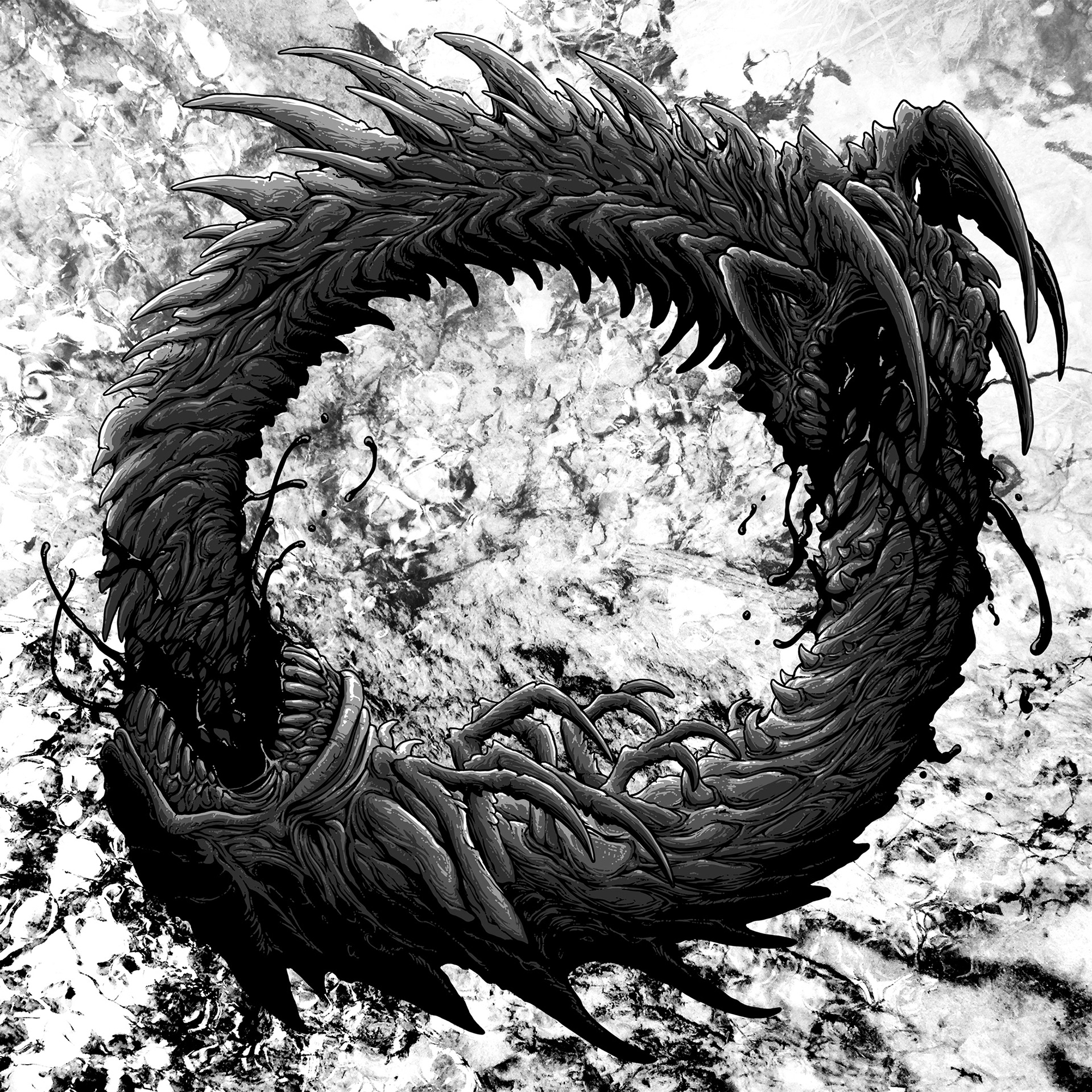 Album cover art done for my friend in the Canadian band OOLUU. Was a nice change to go from all out color to a simple greyscale image, borrowing from the classic ouroboros image and adding my own style to it.